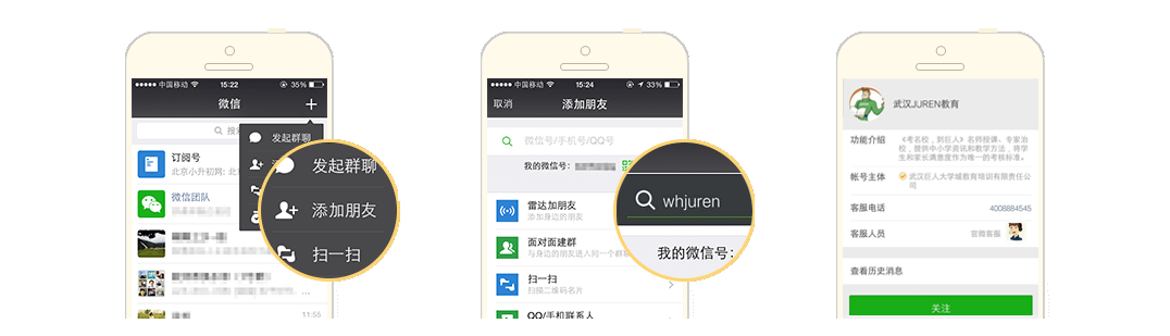 1.打开微信“添加朋友”功能 2.输入微信号 3.关注公众号
