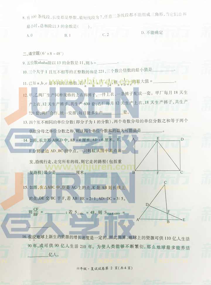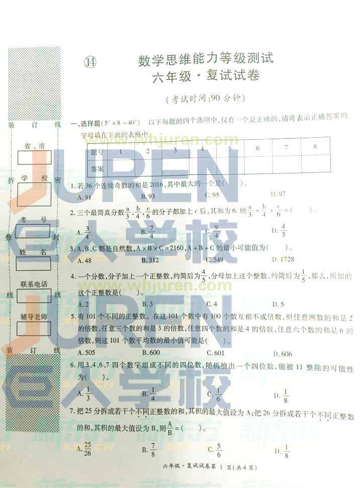 2016年第十四届武汉小学创新杯数学思维能力等级测试小学六年级决赛试卷