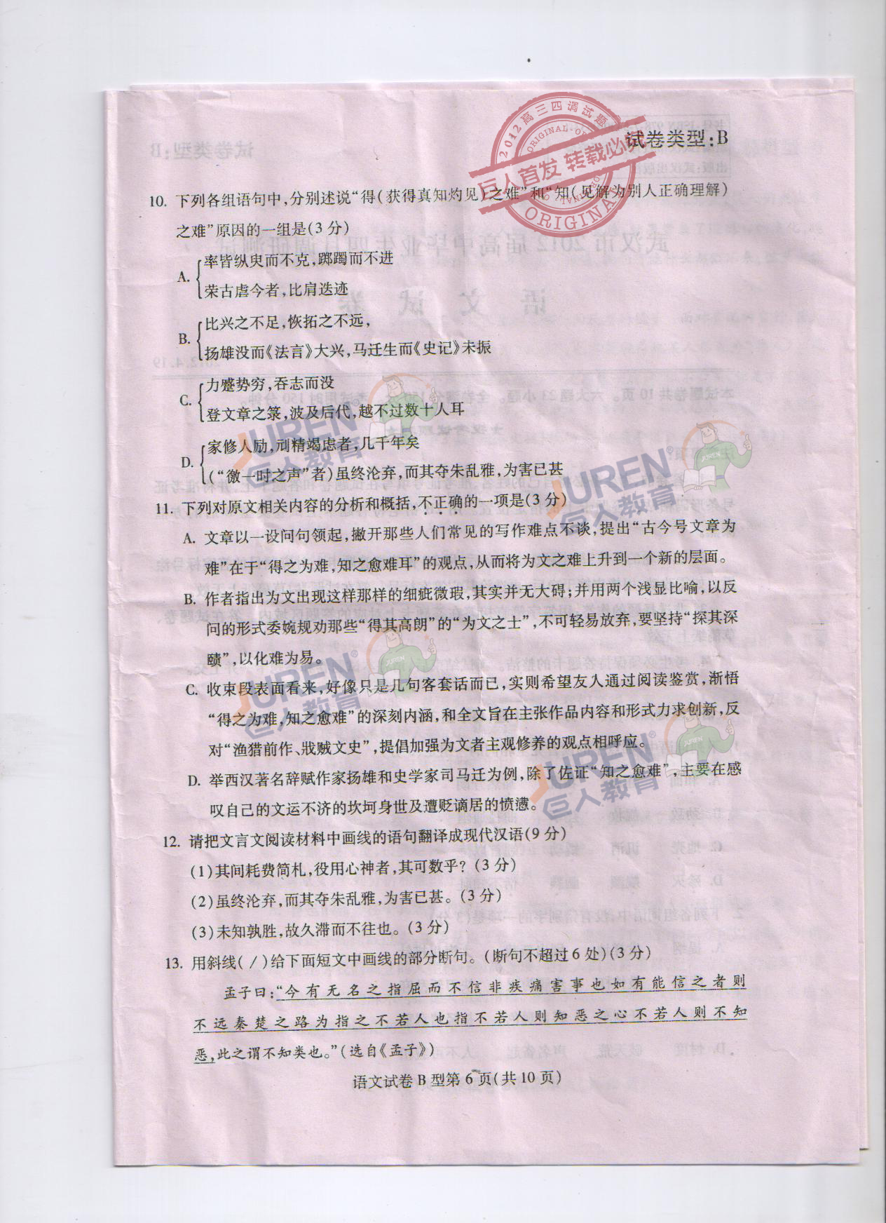巨人独家:武汉市2012年高三四月调考语文试卷