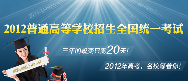 2012年高考离我们越来越近了,马上考生就要奔赴考场,十年寒窗苦读,终于到了验证结果的时候。然而在这最后的冲刺阶段也是最关键的时刻,是否面对如此多的学科和题目还是很迷茫,不知所措呢?好前途、上名校是否就那么遥不可及呢?武汉巨人教育2012高考三年的蜕变只需20天,成就你名校梦想!