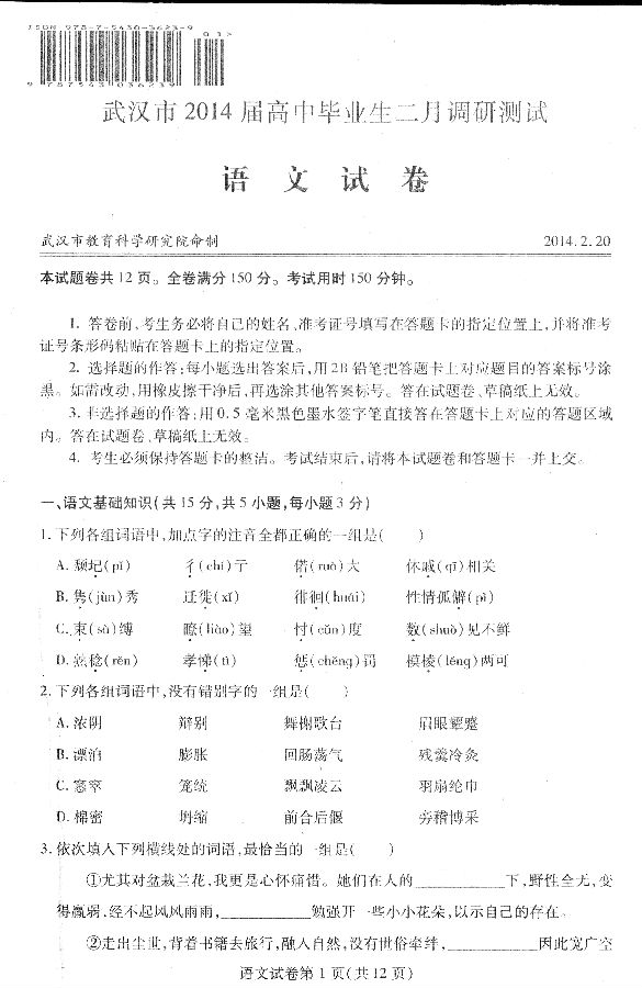 2014年湖北省武汉市高三二月调考语文试卷真题