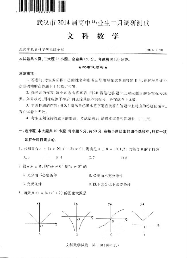 作为高三生都知道武汉市每年的高三二月调考是高考的导向标,2014年高三二月调考是在今天和明天进行,今天是语文和数学两门学科考试,下面就看看小编第一时间整理出来的2014年武汉市高三二月调考文科数学试卷真题,希望各位考生考出好成绩。