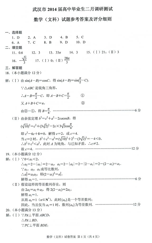 2014年武汉市高三二月调考文科数学试卷参考答案
