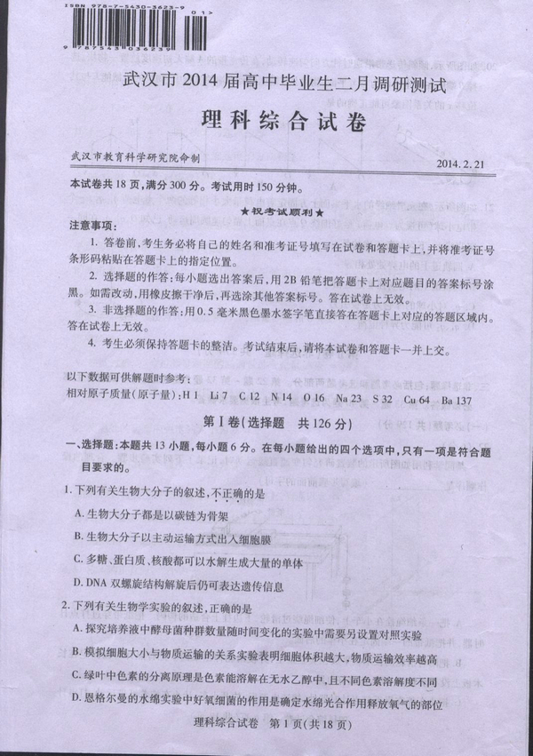 高三学生2014年春季开学已经有段时间了,二月调考是高三学年中比较重要的一次考试,被称为是湖北高考的导向标,通过考试我们也可以清楚看到自己的不足,今天进行的是英语和文综理综的考试,下面就看看我们第一时间发布的2014年武汉市高三二月调考理科综合试卷真题吧!