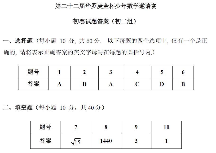 2016年第22届“华杯赛”初赛初二年级组笔试试题答案
