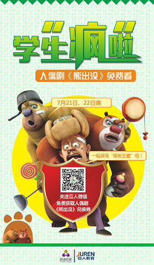 关注巨人微信,即可到巨人任一校区前台领取人偶剧《熊出没》的积分券一张,立即参与积分送券活动!