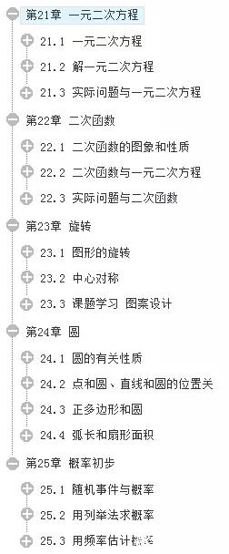 九年级上学期整本教材,即第21章至第25章概率初步,部分知识涉及七八年级数学基础,具体如下: