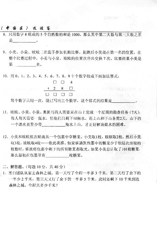 2013年第九届世奥赛武汉赛区三年级真题试卷