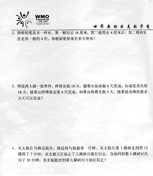 导读:世奥赛已经圆满落下帷幕,拿到世奥赛奖状就相当于拿到直通名校的门票,为了让大家能够及时了解世奥赛的情况,武汉巨人教育网为大家收集了2013年世奥赛武汉赛区各年级的试卷及答案,供大家参考。