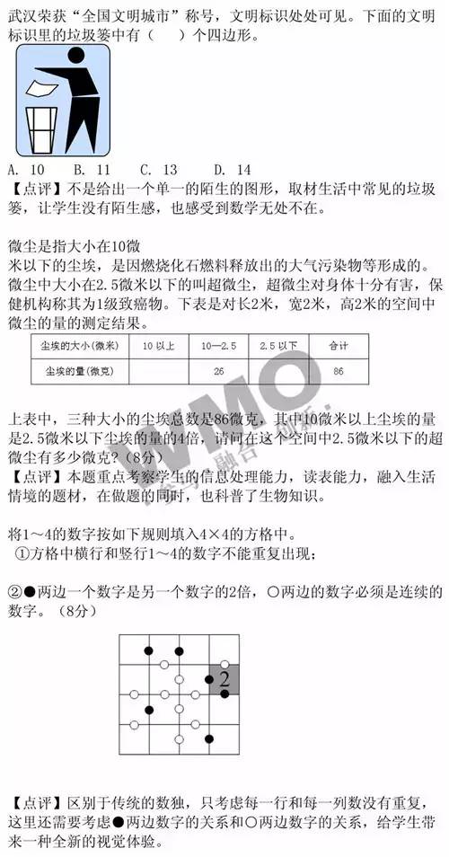 其他的竞赛大多是以“题目”为主要载体,较少考虑时代的发展和学生的生活经验。WMO世奥赛在命题上,以能力考查为导向,培养具有融合思维与创造力、具备优秀的数学素养能力、可以自由跨越学科和知识界限的综合性人才。我们的命题重视时代的进步,关联学生的已有生活经验,在问题呈现上不断创新。如第8题,我们的取材是生活中常见的垃圾篓,让学生感受到数学无处不在。第17题,在做题的同时,也科普了生物知识。本套试卷重在考查学生的问题解决能力,即培养学生应用数学的意识,从这个阶段开始,就应该培养孩子应用数学去解决数学内部和数学外部的问题。