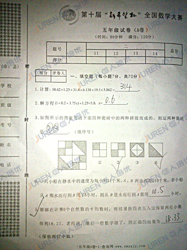 2014第十届新希望杯数学竞赛初赛五年级试卷答案