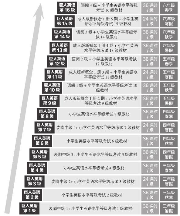 为了满足不同层次学生的要求,同时提高小学生的英语应用能力水平,由武汉巨人、北京巨人、南昌巨人三地共同搭建精英团队,通过数年的时间研发了,小学英语 16 级课程,课程整合了《麦嘟》、《外思语阅突破》及《成人版新概念 1 册》的特点和优势,让学生掌握必考词汇、语法、阅读等知识点的同时,辅以《小学生英语水平等级考试教材》,不仅可以拓宽学生的词汇和语法,而且可以在听说读写译五方面全能解决学习英语的各种困惑,更重要的是,能够提高小学生使用英语的技能,极大地增强学生的竞争力。