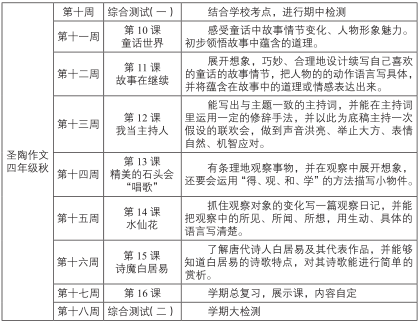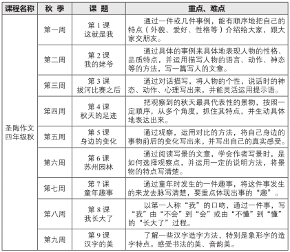 写作课重点训练同学们运用写作技巧将内容写具体、将语言写生动并能写出自己的感悟。同时激发同学们阅读名著的兴趣。基础知识中识字量增大,有一定的独立识字能力,并能高效地积累。阅读课重点引导同学们掌握状物文、叙述文、童话、文言等文的阅读重点及答题方法。