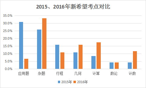 今年的考试,杂题是重点模块,占比达到了33.3%,其次是计算和几何模块,占比都将近20%。其余模块的知识点分步比较均衡。新希望考试历年比较注重实际操作类的题目,题目也比较活,因此在备战后面的杯赛上需要着重于操作题和综合性题目的训练。