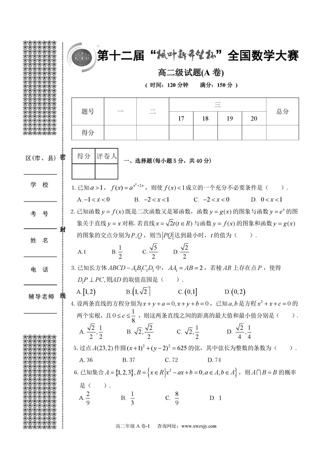 第十二届“枫叶新希望杯”全国数学大赛A卷(高二)