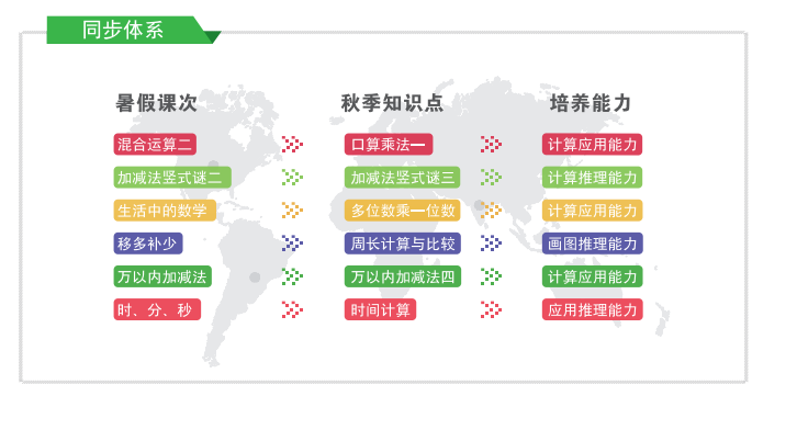 | 8 | 口算乘法一 | 计算 | 对位数乘一位数的不进位,整十百千数乘一位数的口算 |