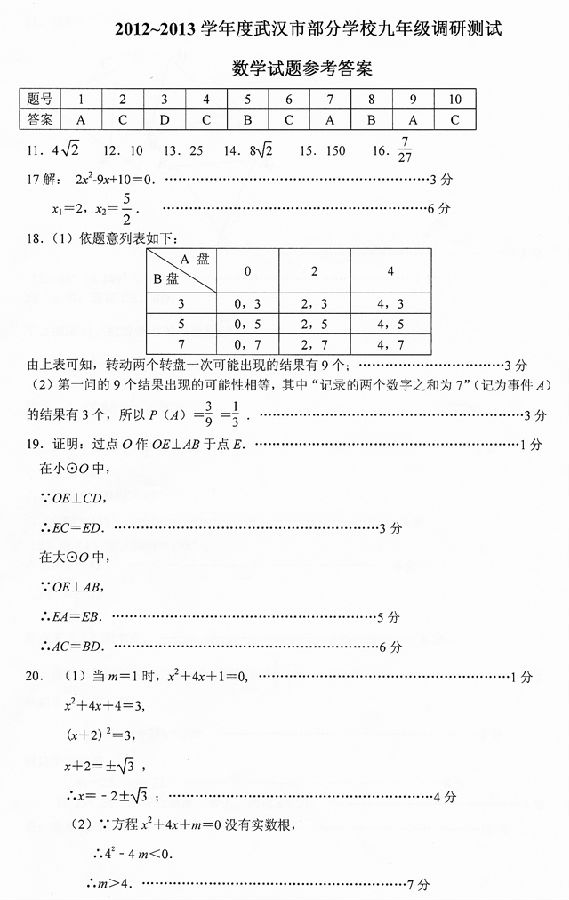 2013年武汉市初三元月调考数学试卷答案
