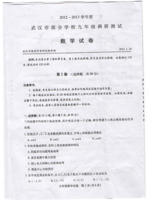 昨天我们武汉市的初三生开始了初三学习中重要的考试——元月调考,不知道大家考得怎么样,在此,我们建议大家要平和心态,学会从考试中总结经验,这样才能更好的备战中考,下面我们武汉巨人教育网小编第一时间为大家整理了武汉市2013年九年级元月调考数学试卷真题,以供参考!