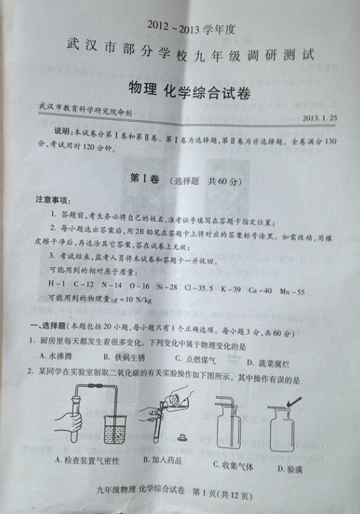 导读:武汉市的初三生今日上午结束了2013年武汉市九年级元月调考物理化学考试,这次考试是2013年中考的风向标,为了帮助大家更好的复习中考,下面我们武汉巨人教育网小编第一时间为大家整理出了2013年武汉市九年级元月调考物理试卷答案,希望能够助大家一臂之力!