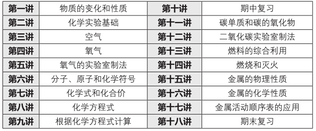 教学内容以九年级上册课程内容为主,对化学基础知识进行预热。