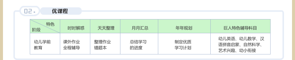 | 数学 | 2012幼儿数学智力开发宝典 | 包含数字书写课、数学主题课、超级心算以及自然科学和科学小实验课。主要使用教材为《数学思维乐园》、《超级心算》、《科学小实验》。数学主体课选择幼儿生活紧密联系的主题活动,由浅至深,由具体到抽象,重点进行运算、图形和逻辑思维的学习,内容涵盖了幼儿数学大纲,并融入华数、奥数精华。>>查看详情 | 在线咨询>> |