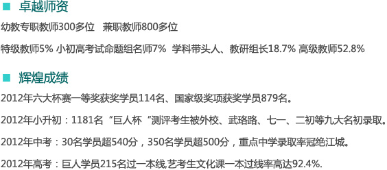 巨人学前课程不仅包含超素班、尖子班为优秀学生量身定做的课程,同时有自主开发的优质课程,由巨人幼教中心教研团队联合武汉各名小优秀教育专家精心打造,每年帮助上千学员升入重点名小,升学率达99%以上,成为广大家长和学生最值得信赖的一流学前教育品牌——巨思玛特……详细>>