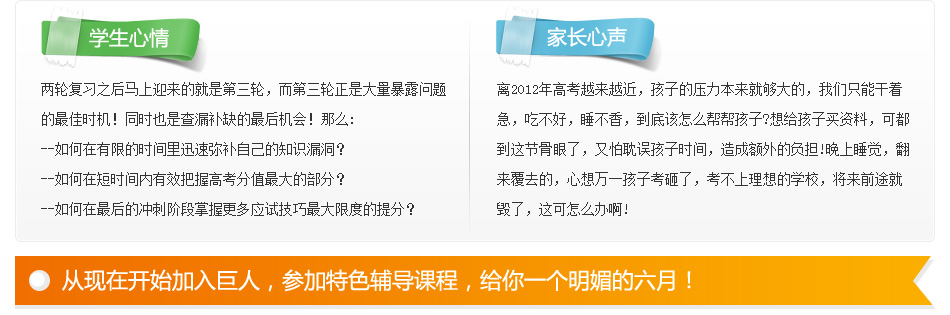 | 语文 | 语文冲刺班 | 高考试卷四大难点零失分冲刺:诗歌鉴赏、文言文、社科文、文化散文阅读之 答题技巧总梳理;高考作文之审题立意材料模式全突破。>>查看详情 | 在线咨询>> |