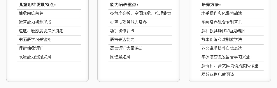 | 数学 | 2012幼儿数学智力开发班 | 包含数字书写课、数学主题课、超级心算以及自然科学和科学小实验课。主要使用教材为《数学思维乐园》、《超级心算》、《科学小实验》。数学主体课选择幼儿生活紧密联系的主题活动,由浅至深,由具体到抽象,重点进行运算、图形和逻辑思维的学习,内容涵盖了幼儿数学大纲,并融入华数、奥数精华。>>查看详情 | 在线咨询>> |