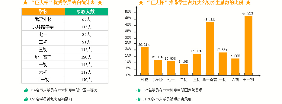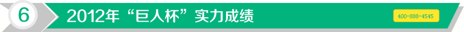 在2012年巨人杯测评中,1181名“巨人杯”测评优秀考生被九大名初录取,占九大名初招生总额的18%,其中,巨人学员857名被九大名初录取。