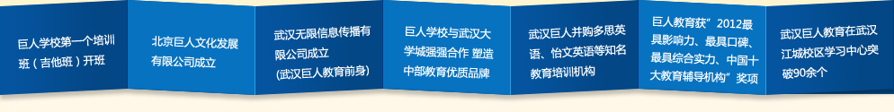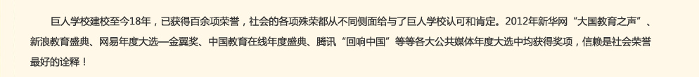 过去的一年,武汉巨人迈出了跨越式的步伐:教学成绩硕果累累、就读学员超过6万人次、校区突破70余个……学校品牌、知名度、美誉度不断提升,享誉荆楚。新的一年,巨人将不断前进。 查看详情>>