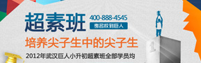 - 巨人针对于小升初的学生推出了一种新的班型——巨人超素班,超素班着重培养尖子生中的尖子生。2012年武汉巨人小升初超素班全部学员均考入武珞路中学,“超素班”使得升名校如愿,“早培人才”是我们的根本目标!查看详情>>