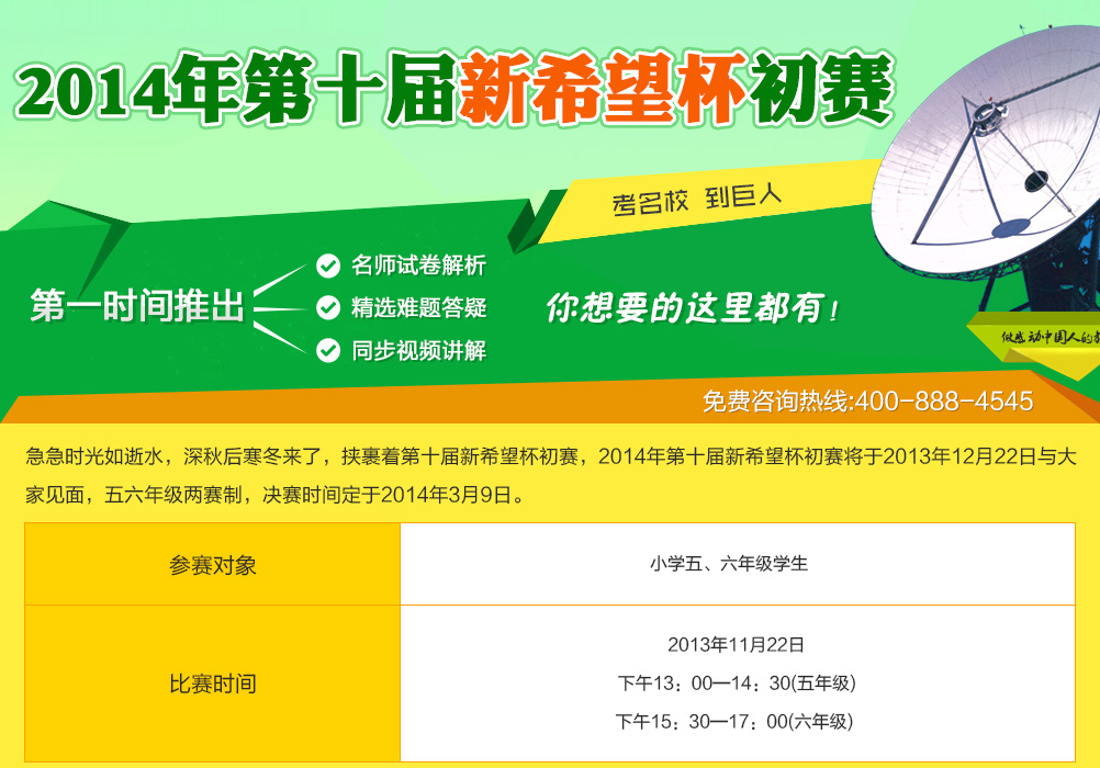 自2003年,全国小学数学希望杯比赛已举行了九届。前三届参赛对象为四、五年级学生,由第四届开始,小学六年级学生也可正式参加比赛,因此,毫无疑问地说,明年“希望杯”的获奖成绩是与小升初直接挂钩的。