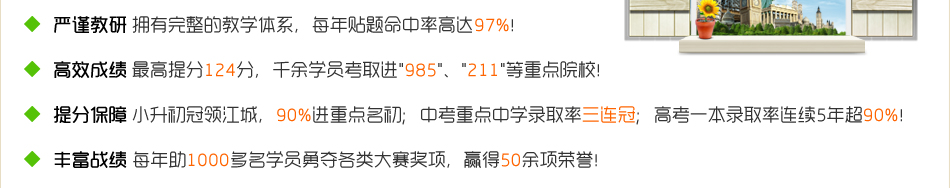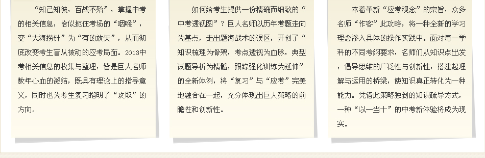 | 英语 | 冲刺2013中考英语全年课程 | 1、较之传统初三英语课程的"地毯式"语法大扫荡,本课程直接、迅速攻破历年中考高频考点。 2、强化的听力训练,让学生不再惧怕听不懂的"听力测试"。 3、中考真题专业剖析,高频考点当堂演练,掌握完型填空、阅读理解填词解题技巧。 |