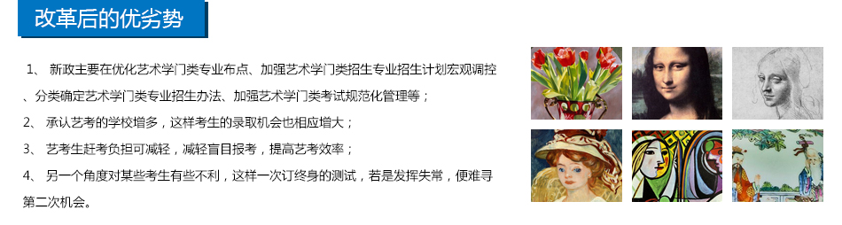 | 根据教育部《艺术学门类专业招生工作的指导意见》 (征求意见稿)和调研会上的信息,改革主要包括两方面内容: |