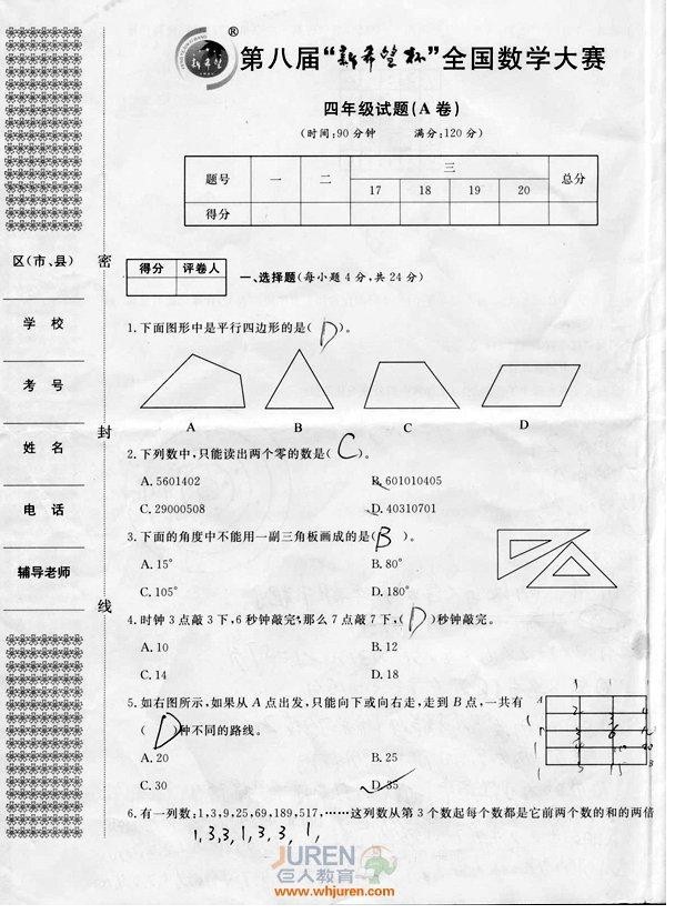 导语:作为武汉市奥数战役的重要一战,2012年新希望杯决赛圆满结束,您想了解今年新希望杯赛的题型么?您孩子考完了想对一下正确答案么?以下为武汉巨人教育独家首发新希望杯赛决赛真题试卷和参考答案!更多小四的最新资讯和权威信息尽在小四家长交流群:144943063